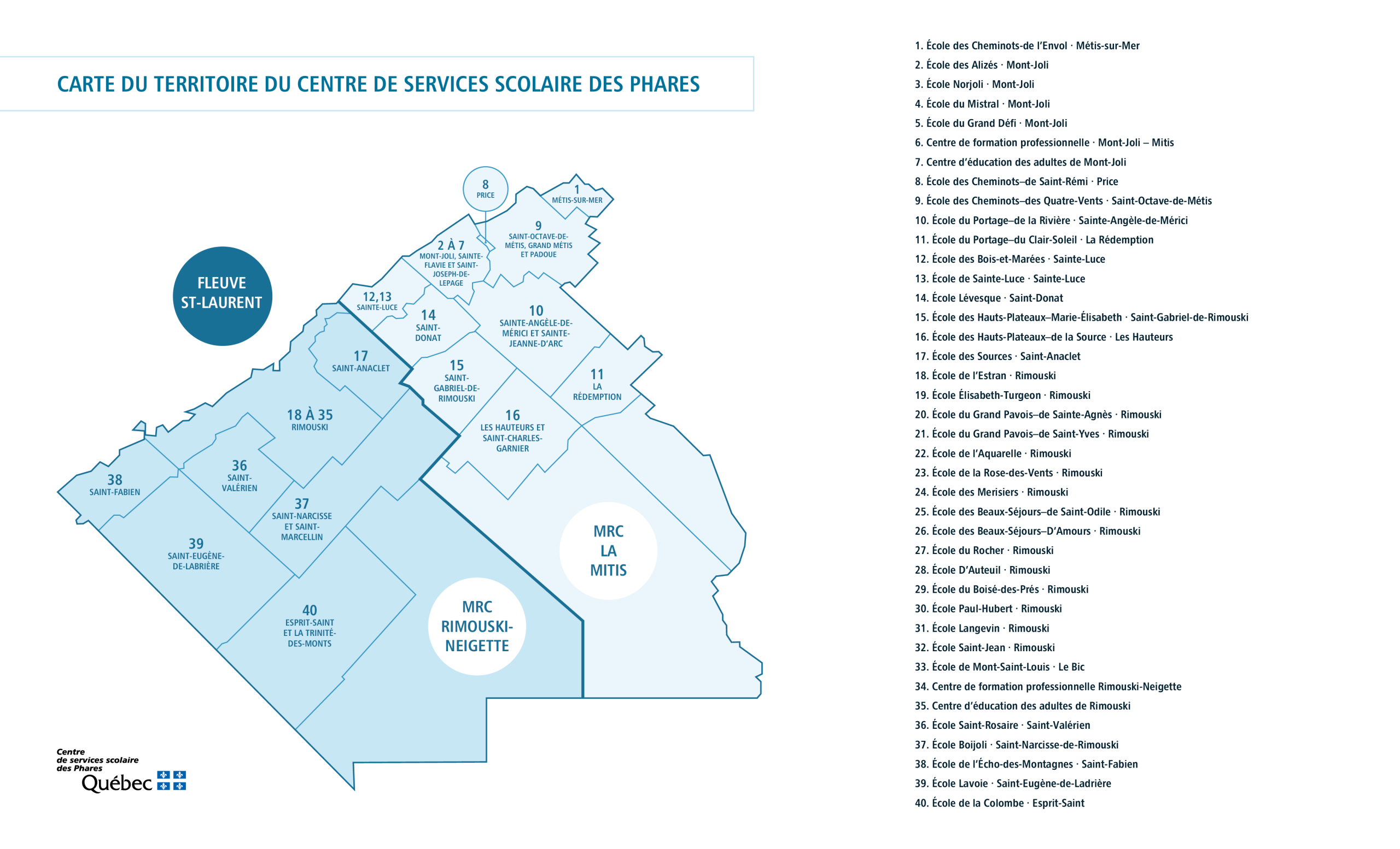 Nous couvrons le territoire des municipalités régionales de comtés de La Mitis et Rimouski-Neigette et offre des services à près de 10 000 élèves, jeunes et adultes.
